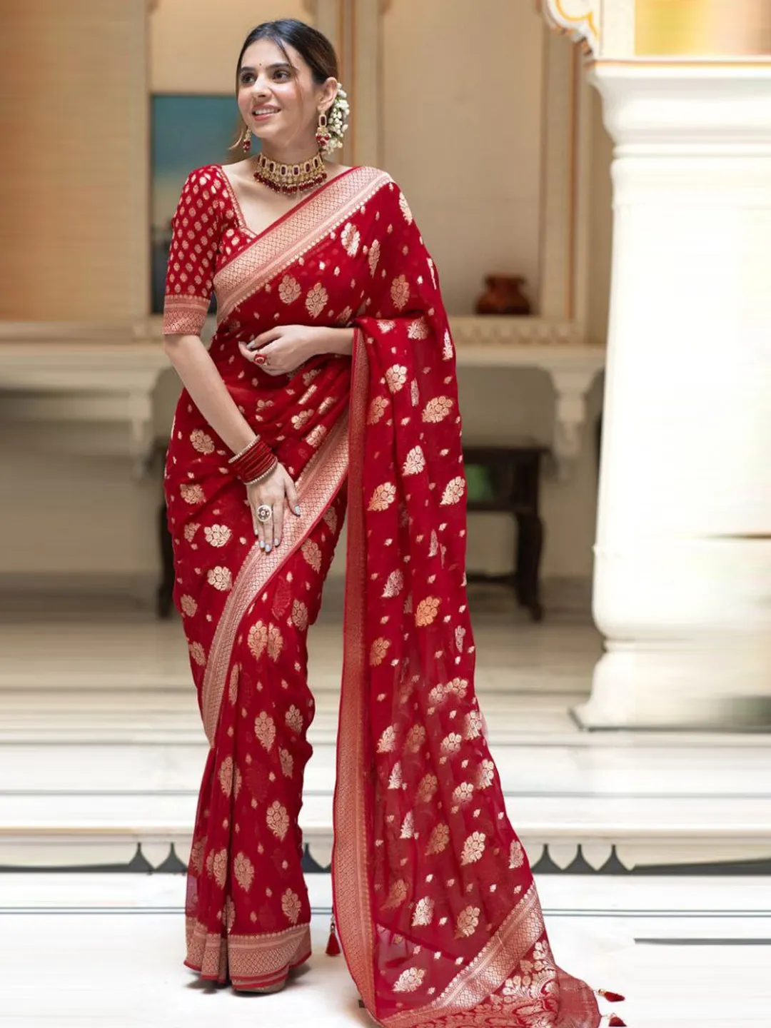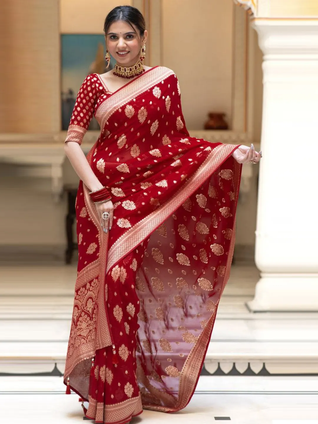 Red and Maroon color Saree in Banarasi Silk fabric with Weaving work